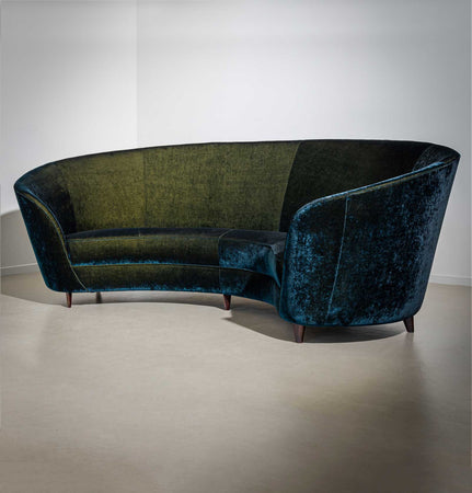 This highly elegant semi-circular sofa was designed by Ico Parisi in the 1950s. The exceptionally designed sofa describes a semi-circle with soft rounded sides and seats and rests on tapered legs made of polished wood. The sofa has been professionally reupholstered. The high-quality, elegant velvet cover shimmers in blue and green depending on the angle of view. This iridescent effect flatters the round shape of the sofa and gives it a special touch. The sofa is accompanied by the Ico Parisi archive certificate.