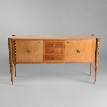 Italian Mid Century cabinet by Pier Luigi Colli. Maple, Birds Eye Maple, carved details, patinated brass details.
