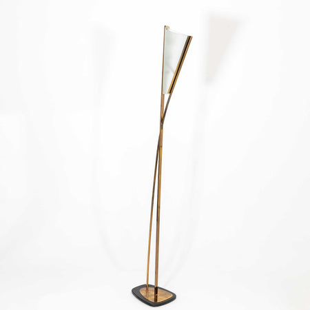 Italian Modernist floor lamp, designed by the renowned designer Max Ingrand in circa 1958. The lamp showcases Ingrand's signature mastery of glasswork, featuring curved satin finish glass shades. The glass shades are elegantly complemented by polished brass elements. The lamp is supported by a dark metal base, which contrasts beautifully with the brass and glass elements, creating a balanced and visually compelling silhouette. Referenced in Franco Deboni's Fontana Arte, Turin 2012, fig. 387.