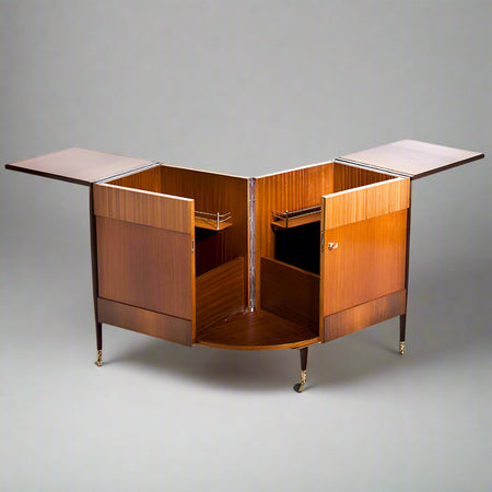 An Italian Modernist folding bar cabinet. Bar folds open in the middle and is finished on all sides to be free standing. Mahogany,teak, patinated brass details.