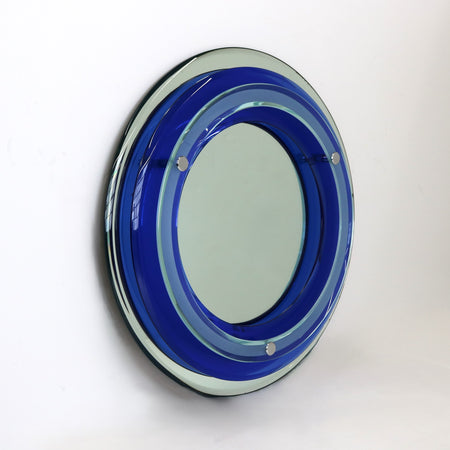 Modernist round three-tier art glass mirror by Veca. Three tiers off glass including a mirrored bottom layer a central blue glass layer and a top layer of clear glass with frosted banding and chrome mount details.