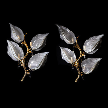 A large pair of bronze wall lights by Franco Luce. Featuring a stylized cast bronze branch stem with four large murano glass leaves in a white filigrana technique on each light.