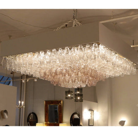 A large Venini glass light installation. Numerous clear and rose colored glass cylinders hang from a metal wire frame lit with eight lights from above. Enclosed in a modern wooden enlosure. Originally installed in Hotel Bristol, Italy. Multiples available.
