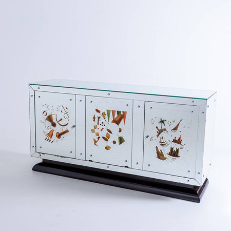 Mirrored Bar cabinet by Bar Tugas. Eglomise glass doors , central revolving bar shelving compartment is flanked by two side cabinets. Resting on an ebonized wood base. Marked Bar Tugas.