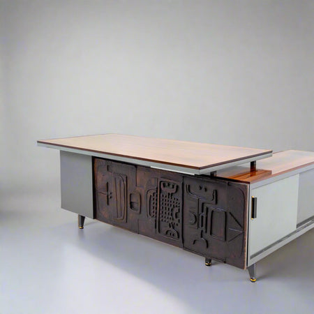 Large metal executive desk with side shelf and wooden relief by Nerone Ceccarelli and Giovanni Patuzzi.