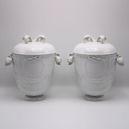 A pair of KPM covered vases in the “Ribbon” pattern from Berlin, Germany circa 1960. Each vase retains its original lid cover.