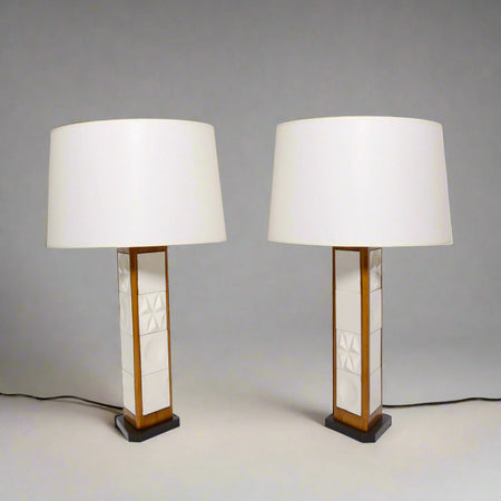 A pair of Modernist table lamps designed by George Nelson.Triangular stem in walnut with matte white decorative ceramic tiles on a patinated bronze base.Tiles also designed by George Nelson for the Pomona Tile Co. California.