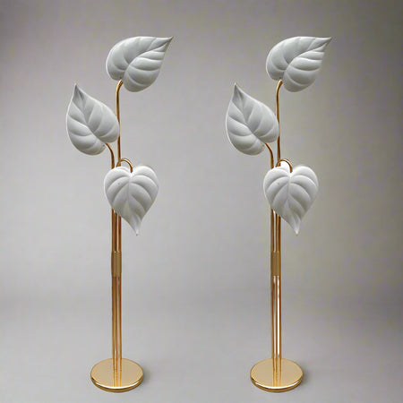 A pair of Italian Modernist three light floor lamps. Patinated brass with stylised ceramic leaf diffusers.