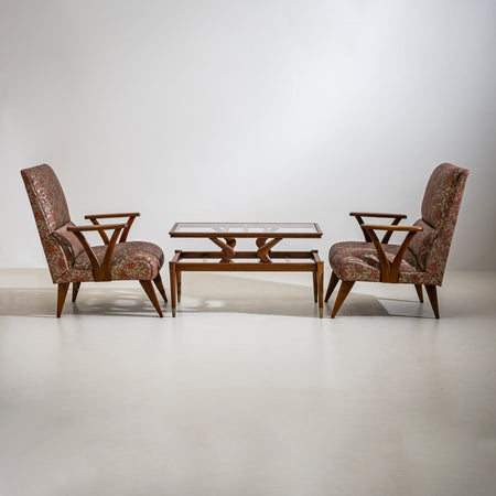 Pair of lounge chairs featuring armrests and slightly splayed legs. Upholstered in embossed faux leather with a floral pattern. The wooden elements have been professionally refinished.