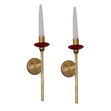 Brass base, frosted glass shades and red acrylic bobeche detail.