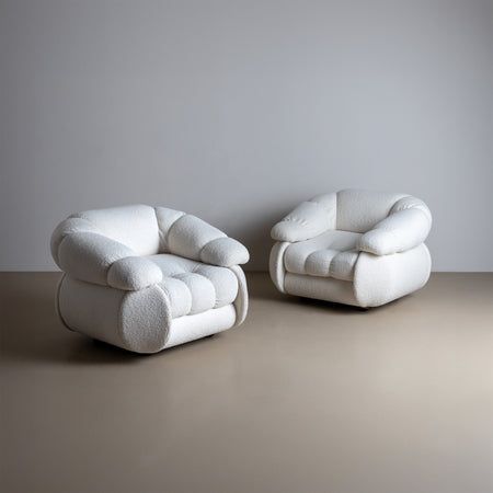 This pair of lounge chairs by Italian designer Adriano Piazzesi dates back to the 1970s. The chairs feature a soft, cloud-like design and have been reupholstered in white bouclé fabric. Piazzesi (1923-2009) is renowned for his organic and sculptural designs that blend comfort and aesthetics.