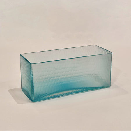 This beautiful rectangular glass vase, crafted by the renowned glass artist Paolo Venini in the 1950s. It embodies the finest Murano craftsmanship featuring a striking turquoise color with a special textured pattern and a unique matte finish which adds depth and character. It bears the artist signature on the bottom.