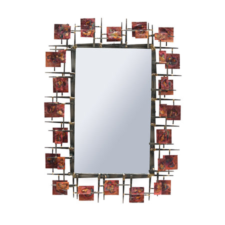 A sculptural contemporary Brutalist mirror. Patinated metal frames. America