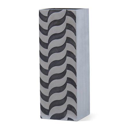 A sculptural Modernist tall vase by artist Lorenzo Burchiellaro. Textured cast aluminum with wave pattern detail.