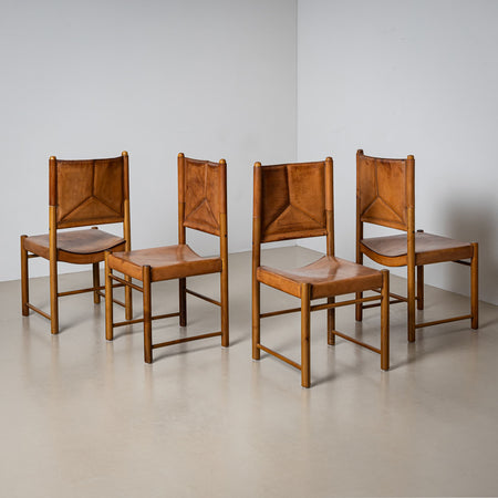 Set of four Italian chairs crafted from light wood, featuring backrests and seats upholstered in cognac-colored leather. The natural patina of the leather, combined with the clean, linear frame, gives these chairs a distinctive bohemian vibe.