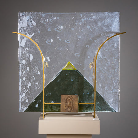 Set of four square wall lights with handcrafted Murano glass shades in clear and deep green glass, featuring a geometric composition with a pyramid-shaped design. The textured, hammered glass surfaces are mounted in sculptural, forked brass brackets. Each piece bears a metal plaque with an engraved mark and retains the original Leucos and Murano label in the upper corner. Likely a custom commission for a special project. Bold and architectural lighting pieces of Italian modernist design.