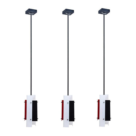 Set of three ceiling lights 315 by Jean Boris Lacroix for Luminalite. Pendant lamp with a black metal stem consisting of rectangular shades of acrylic in white, red and black. 3 pendants in the set. Lit: Clémence & Didier Krzentowski: The Complete Designers' Lights II, Paris 2014, p. 96f. THESE FIXTURES ARE NOT UL WIRED.