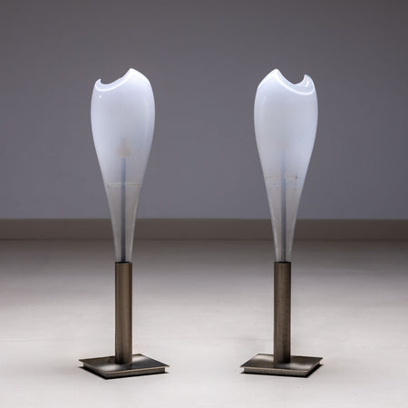 Pair of petite table lamps featuring white Murano glass shades in a teardrop design, complemented by nickel-plated bases. These lamps retain their original wiring and are marked with the label "AVMazzega - Made in Italy" on the side, ensuring their authenticity and quality craftsmanship.