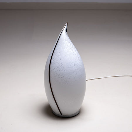 Small Murano glass table lamp with a white, drop-shaped body with air bubble inclusions and a black line.