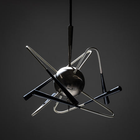 Futuristic five-arm Space-Age chandelier featuring a central aluminum sphere and elegantly curved arms with black sockets. The design evokes the look of a satellite, embodying the innovative spirit of the 1950s.