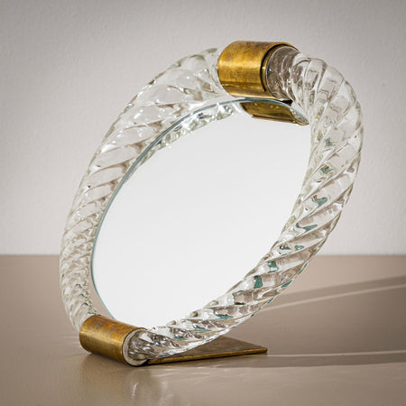 An elegant table or stand mirror by Seguso, crafted in the 1970s. The frame is made of twisted clear glass, adding a touch of stylish dynamism to the design. Brass fittings provide refined accents, emphasizing the high-quality craftsmanship.