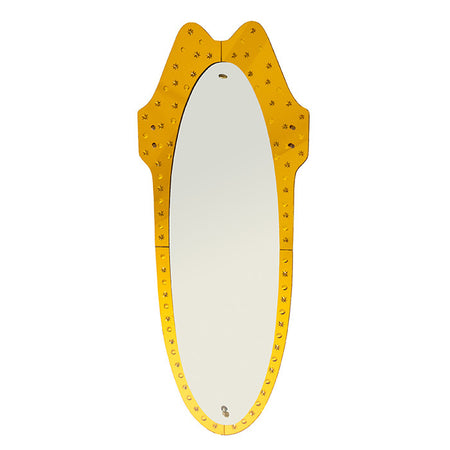 A tall sculptural Crystal Arte Modernist wall mirror. Sculptural outer frame of amber glass with decorative details surrounds the main oval mirror shape. Model # 2843 from the Crystal Arte catalog.