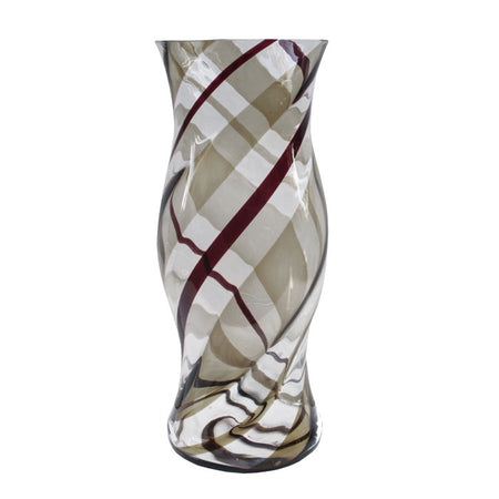 A tall Italian Art Glass vase attributed to Fulvio Bianconi for Venini from Italy circa 1950.  Clear cased glass with fused brown and purple spirals. Acid stamped underneath: Venini Murano Italia.