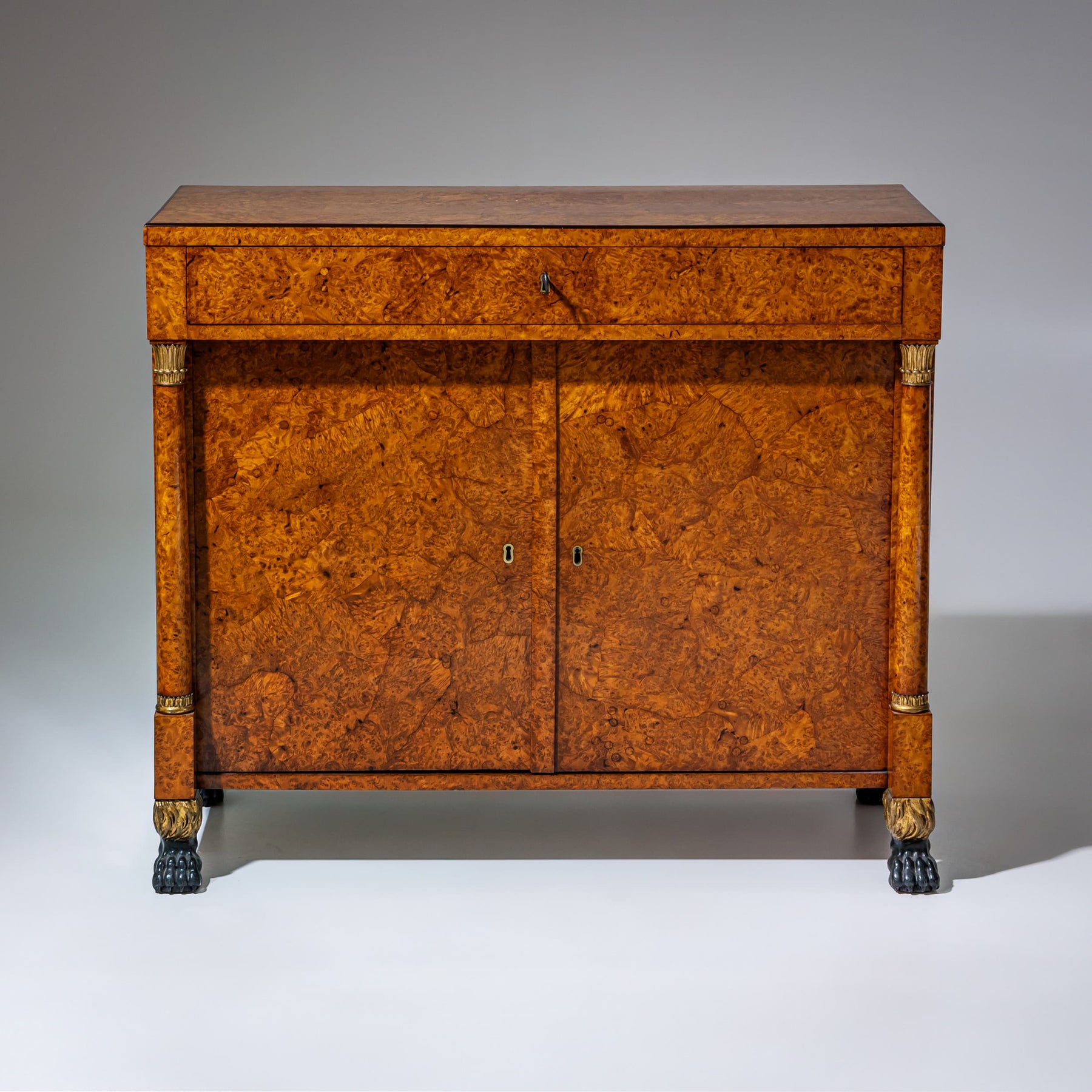 Pair of sideboards or demi-buffets in the Charles X style, each with two doors and a drawer. The pieces rest on partially ebonized and partially gilded paw feet, flanked by full columns with gilt-bronze capitals and bases. Veneered in bird’s-eye maple with darkened edge accents. Each interior features a single shelf.