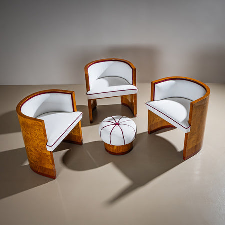 Set of three armchairs and a matching pouf (32 x Ø40 cm) from the Art Deco period. The curved backrests are veneered in burl wood, expertly restored and hand-polished. The pieces have been newly upholstered in white fabric, elegantly highlighted with a fine berry-red piping.