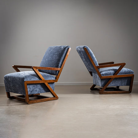 Two lounge chairs with gray velvet upholstery and geometric frame made of solid walnut. Armchairs newly upholstered and polished.