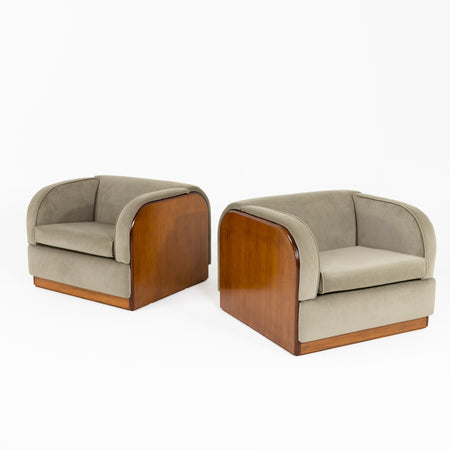 Pair of lounge armchairs in cubic form with upholstered seats, arm and back rests. The veneered side panels are rounded, and the back is also upholstered and reupholstered in a grey-green velvety fabric.