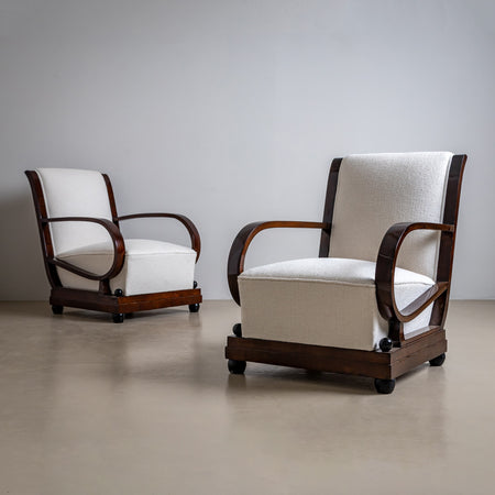 A pair of sophisticated Art Deco armchairs from the 1920s, featuring a gracefully curved beech wood frame and elegantly shaped armrests. The chairs are adorned with distinctive spherical details, adding to their refined aesthetic.