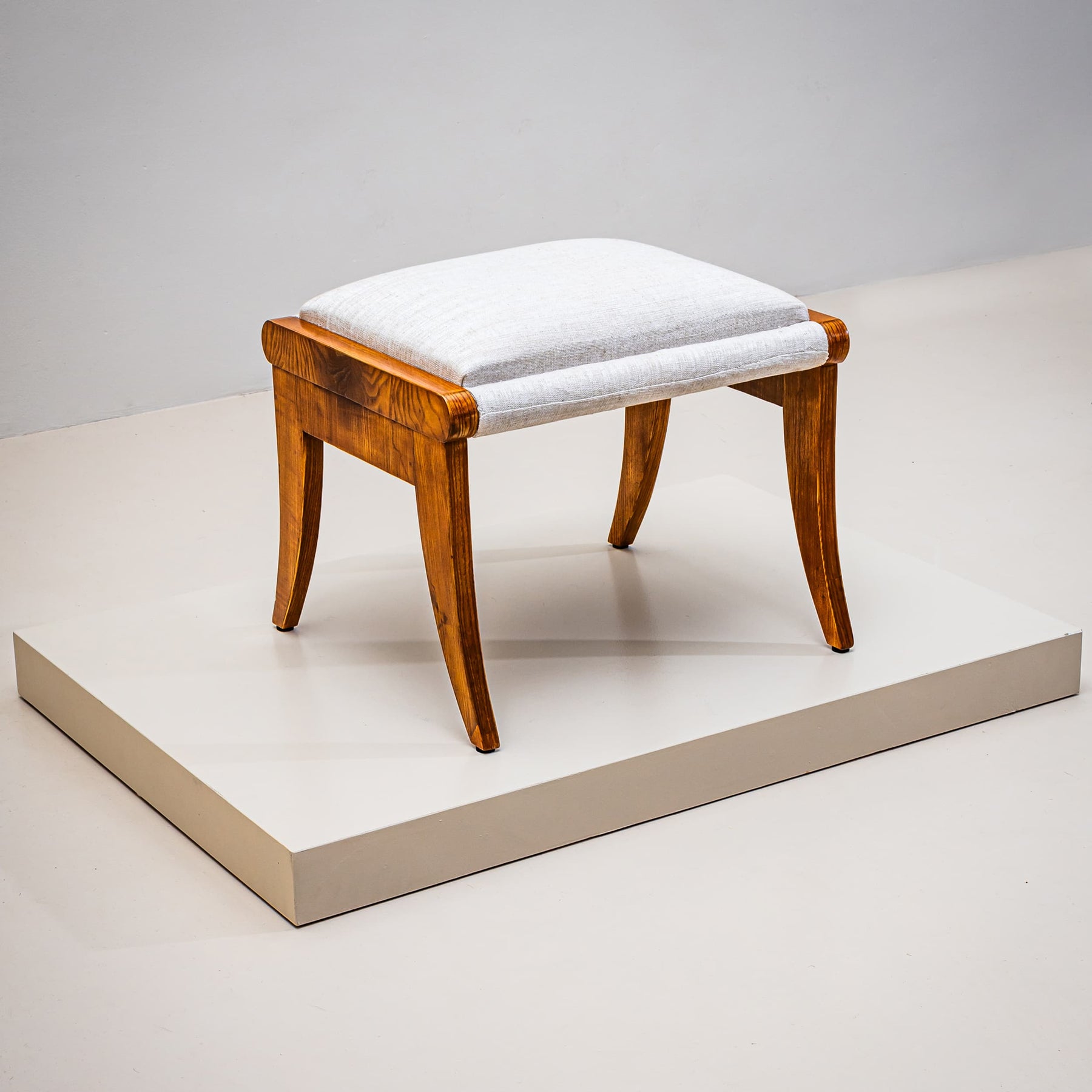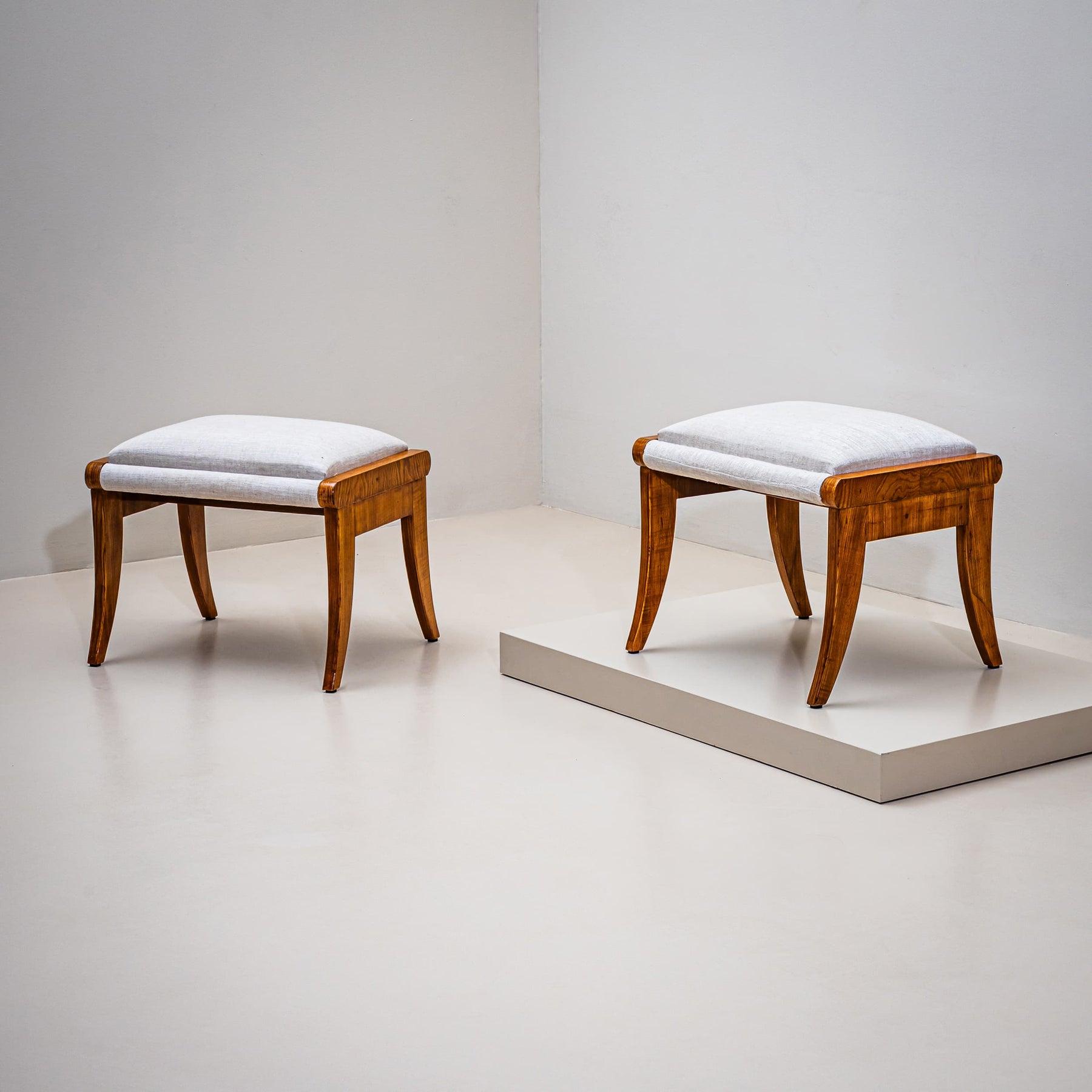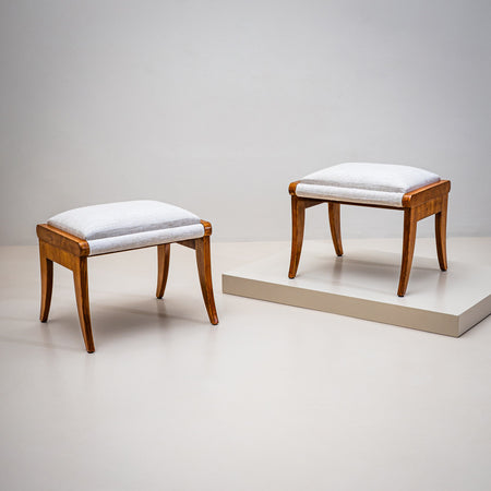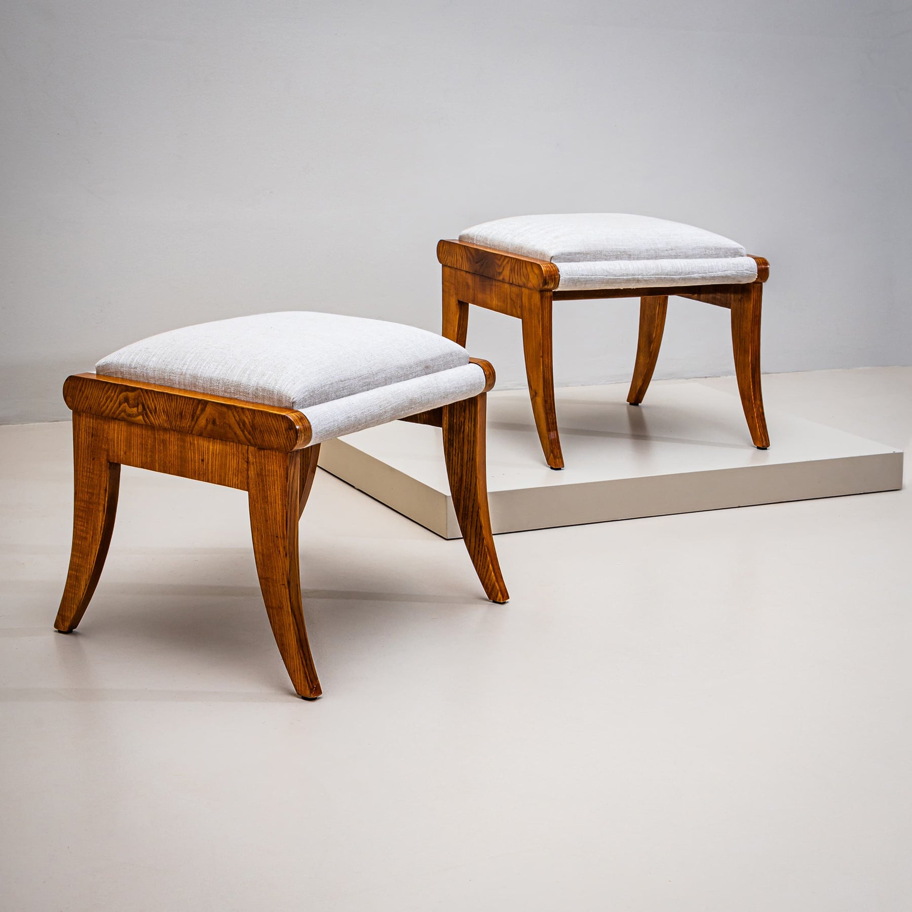 Pair of stools raised on four slightly curved legs with frames in ash. The seats have been newly upholstered in grey fabric. The frames have been restored and carefully refinished.