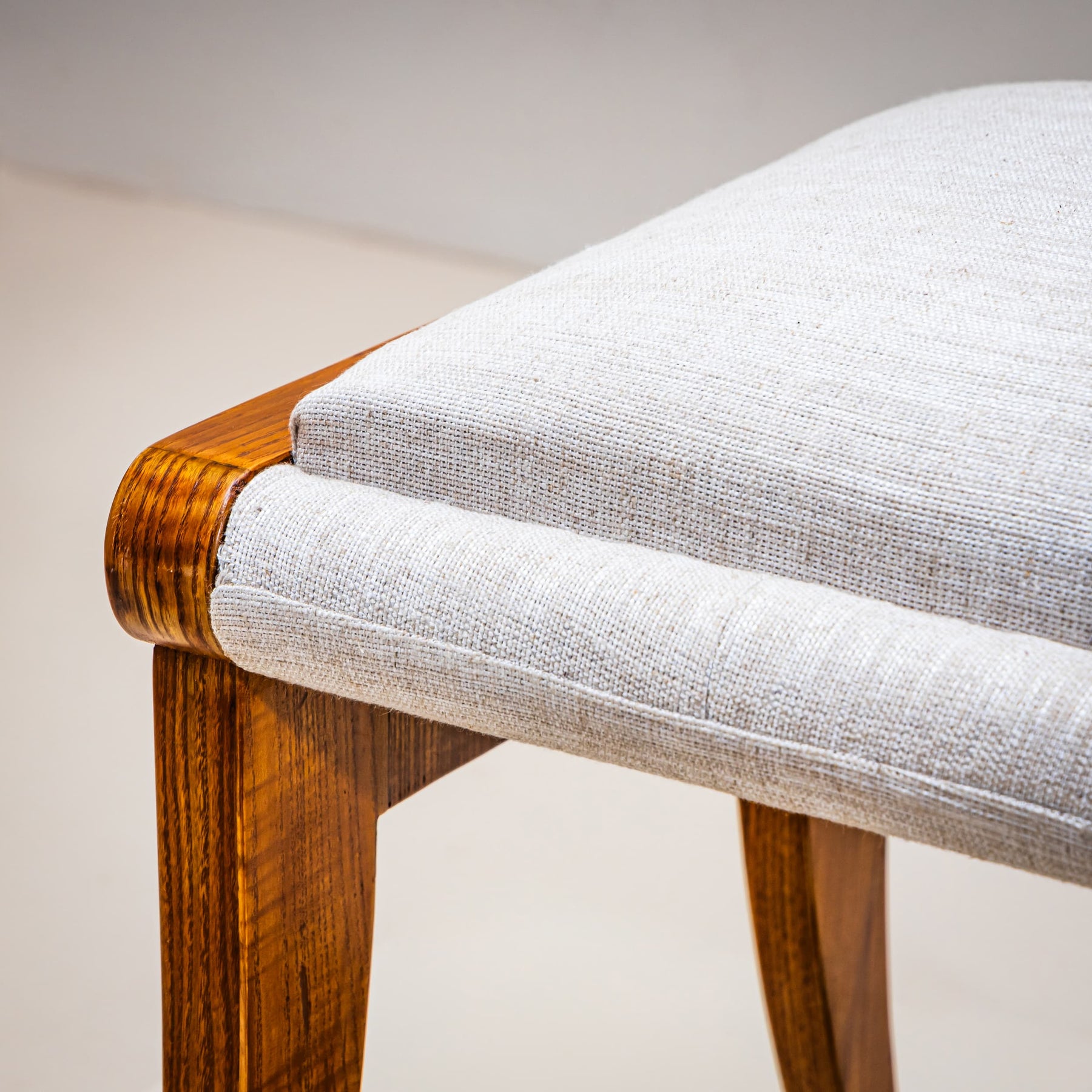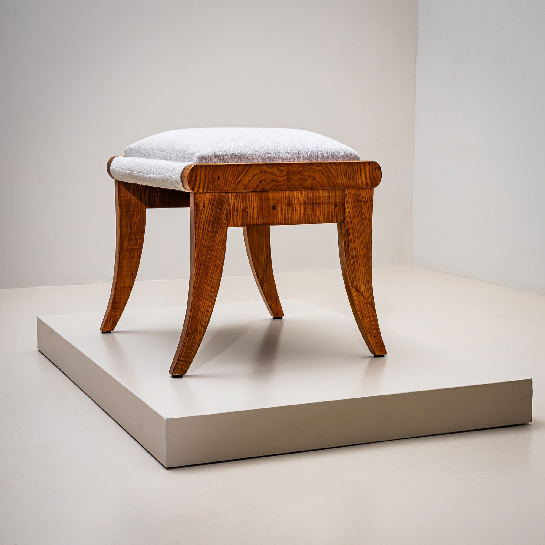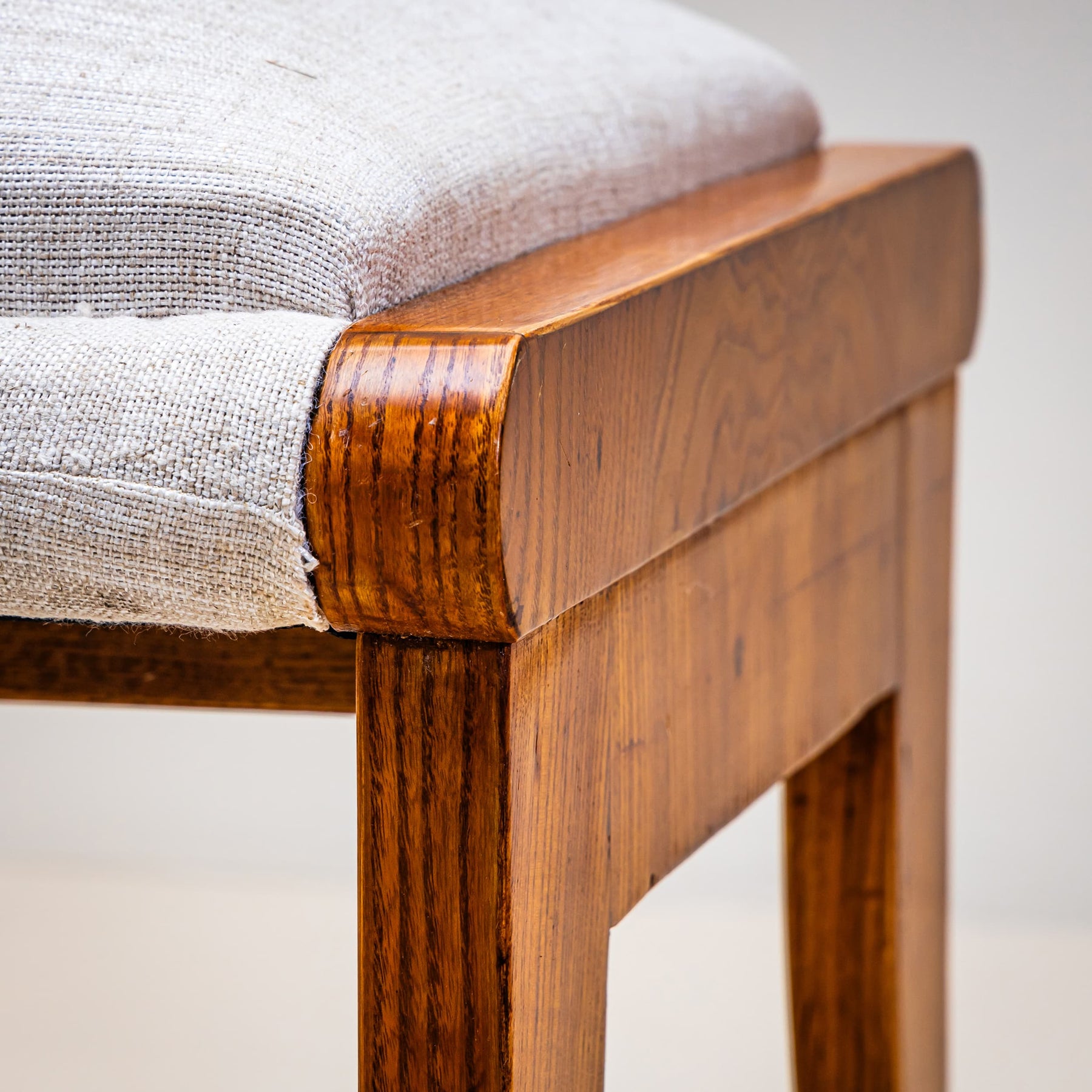 Pair of stools raised on four slightly curved legs with frames in ash. The seats have been newly upholstered in grey fabric. The frames have been restored and carefully refinished.