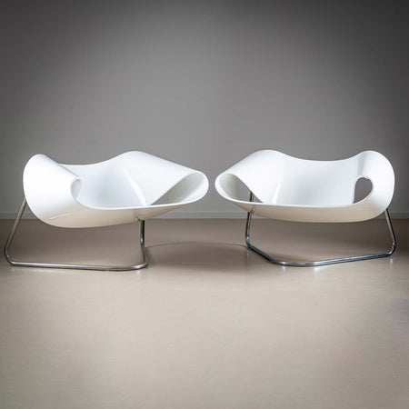 Two CI9 Ribbon chairs by Cesare Leonardi and Franca Stagi, designed for Bernini in 1961. The seats are made of white plastic and rest on tubular steel frames. The unusual design of the seats creates a different impression of the shape of the loop-shaped designer chairs depending on the viewing angle.