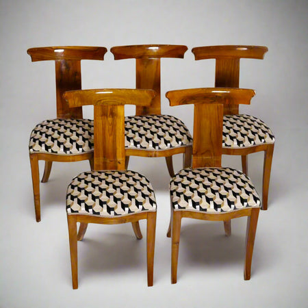 Set of five mid-century dining chairs with elegant t-shaped backrests and slightly flared legs. The chairs have been completely restored and reupholstered with a high-quality fabric showing a sophisticated geometric pattern in dark blue, white, and beige. The chairs are made of solid and veneered walnut.