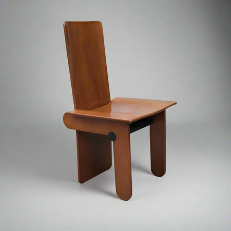 A set of six Modernist dining chairs designed by Carlo Scarpa for Gavina. Stained pine wood with ebonized details.