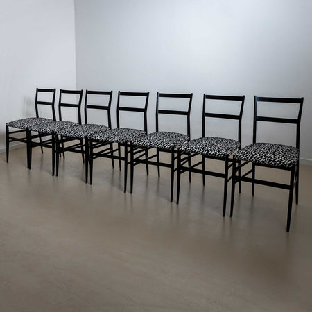 Set of seven side chairs, model Superleggera, designed by Gio Ponti in 1957. The chairs are made of dark stained wood with a smooth polished finish and the seats have been reupholstered. The black and white fabric has a geometric pattern and the backs are slightly curved.