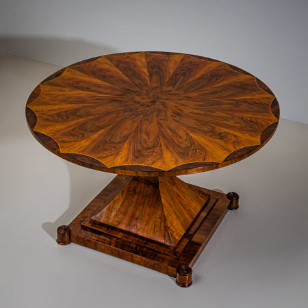 Large Biedermeier salon table with a round top featuring an outstanding radial veneer pattern composed of softly rounded segments. The refined design continues in the square base, with the corners articulated by small cylindrical elements with reeded decoration. These grounded elements are dynamically counterbalanced by a strongly waisted central column with dramatic tapering. The table has been professionally restored and finished with a hand-applied shellac polish.