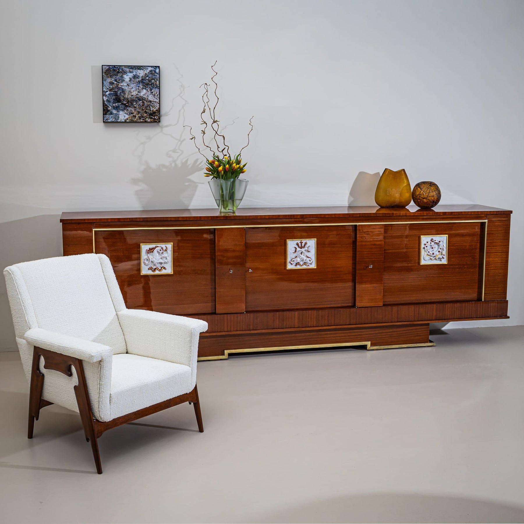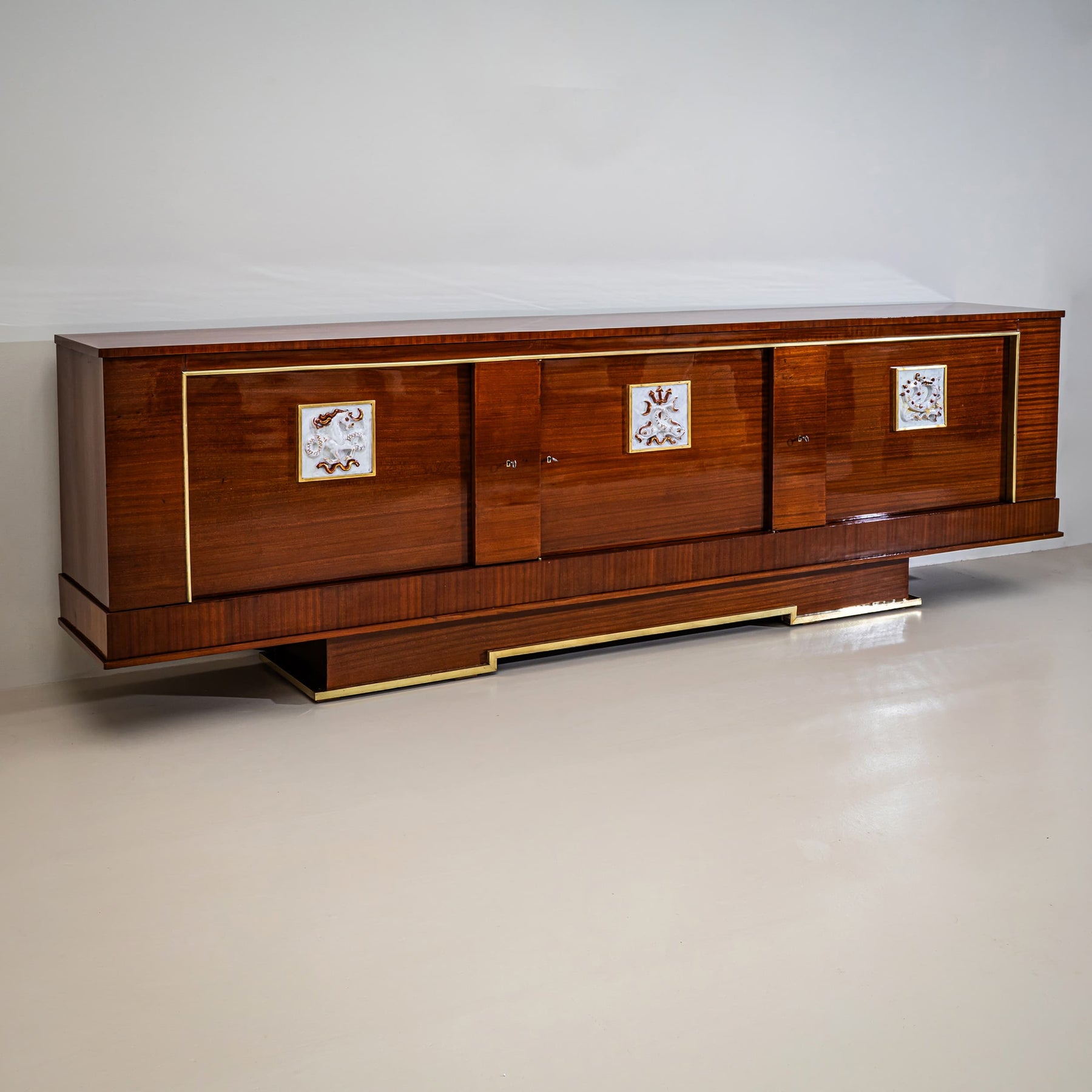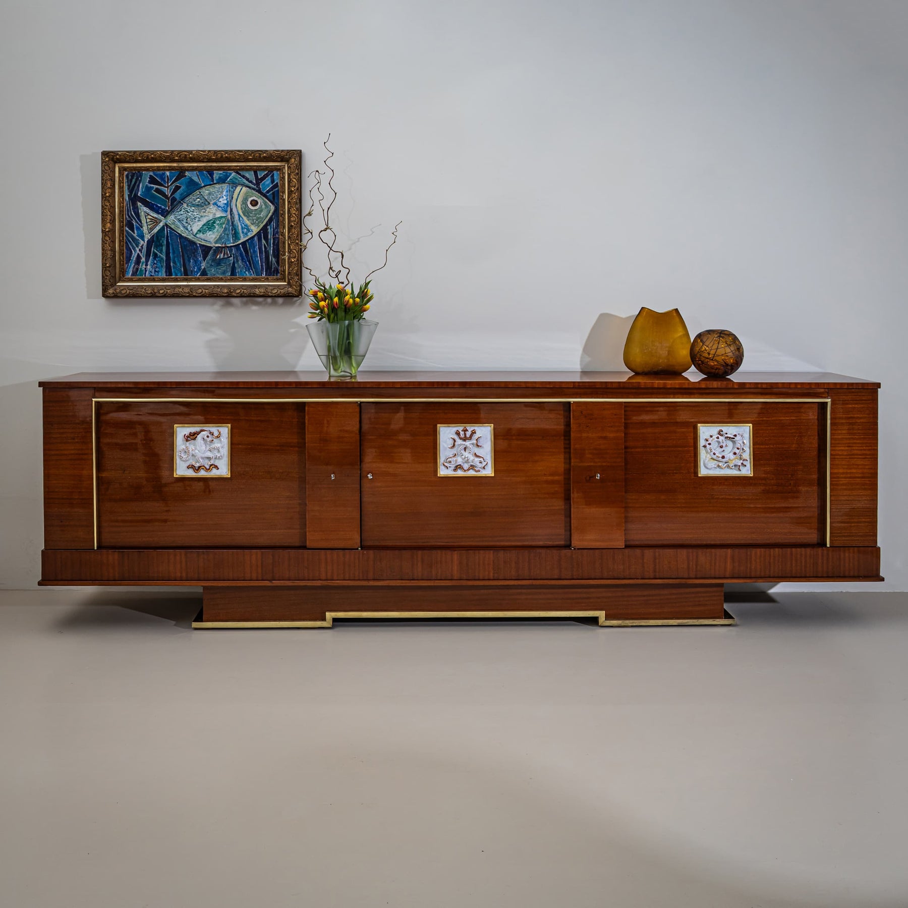 Large sideboard featuring five asymmetrically opening doors and a rectilinear case accented with a brass edge. The piece is veneered in mahogany and fitted with a single shelf behind each door. The doors are centrally punctuated by three ceramic panels. The ceramic elements were created by the French artist Françoise Bizette (1914–1996) and depict mythological sea creatures rendered in relief. The panels are signed “F. Bizette” at the lower right. Bizette produced her ceramic works in her own kiln in Sèvres and worked on commission, including projects for the French state. The sideboard represents a rare and compelling synthesis of French postwar furniture design and artistic ceramic production. Françoise Bizette was a French ceramic artist, painter, and printmaker. She studied at the École des Beaux-Arts in Paris and at the École du Louvre and began her career as a drawing instructor in 1939. She later taught ceramics and art history, notably in Montpellier and at the Lycée de Sèvres. From the early 1950s onward, Bizette regularly exhibited at major French salons, including the Salon d’Automne, the Salon des Artistes Décorateurs, and the Salon des Femmes-Peintres. She received several awards and, between 1956 and 1989, executed monumental ceramic commissions for the French state, public institutions, and historic monuments.