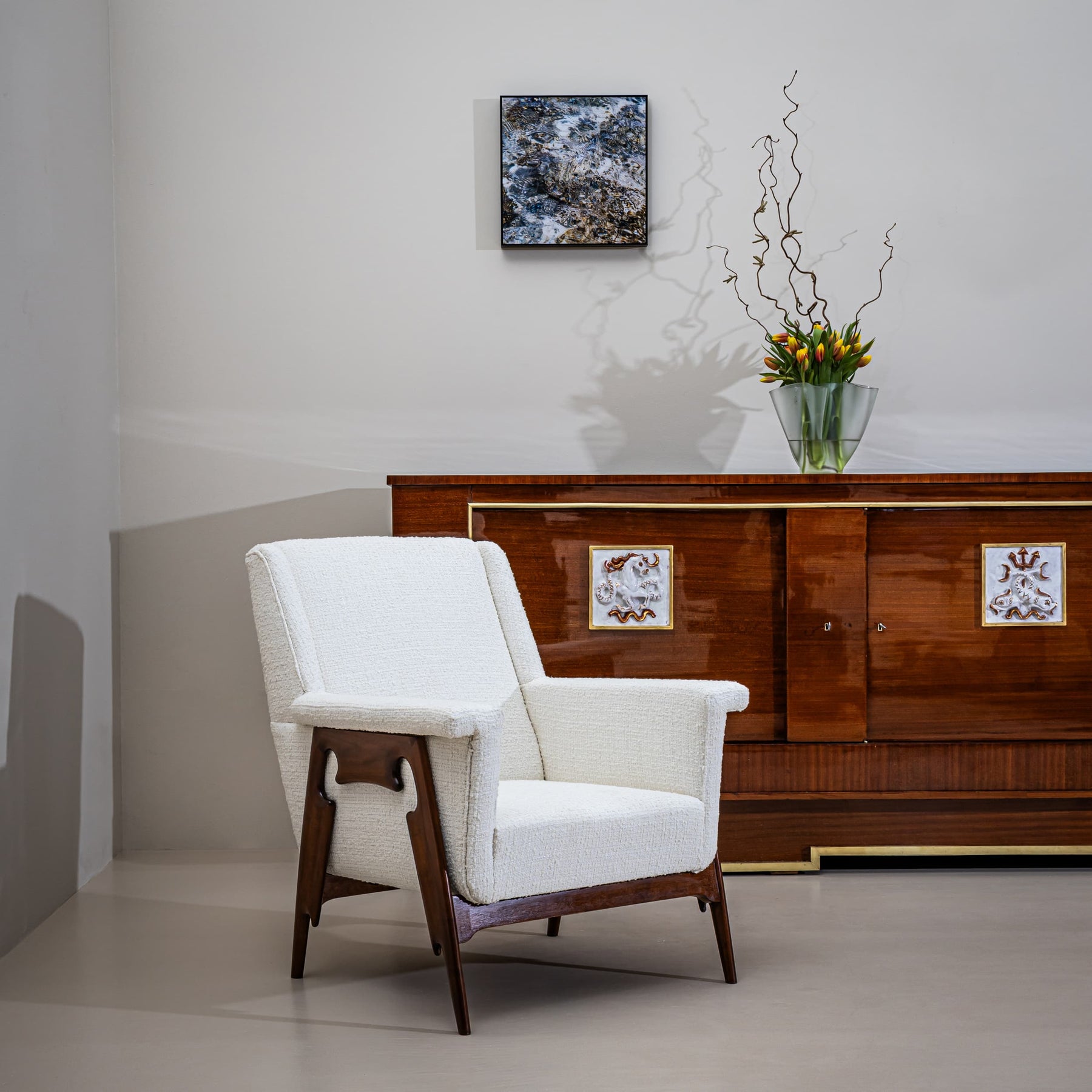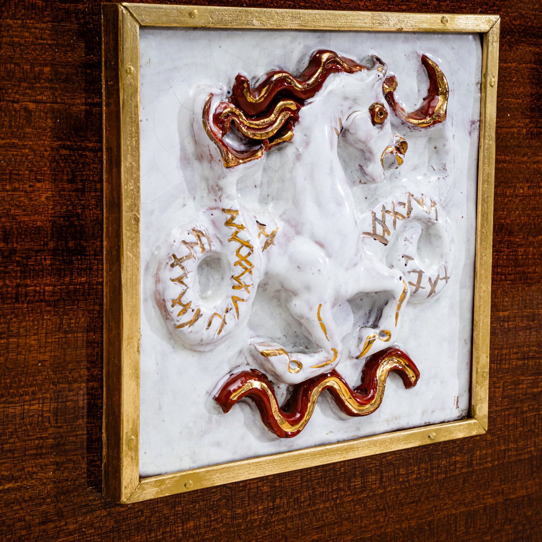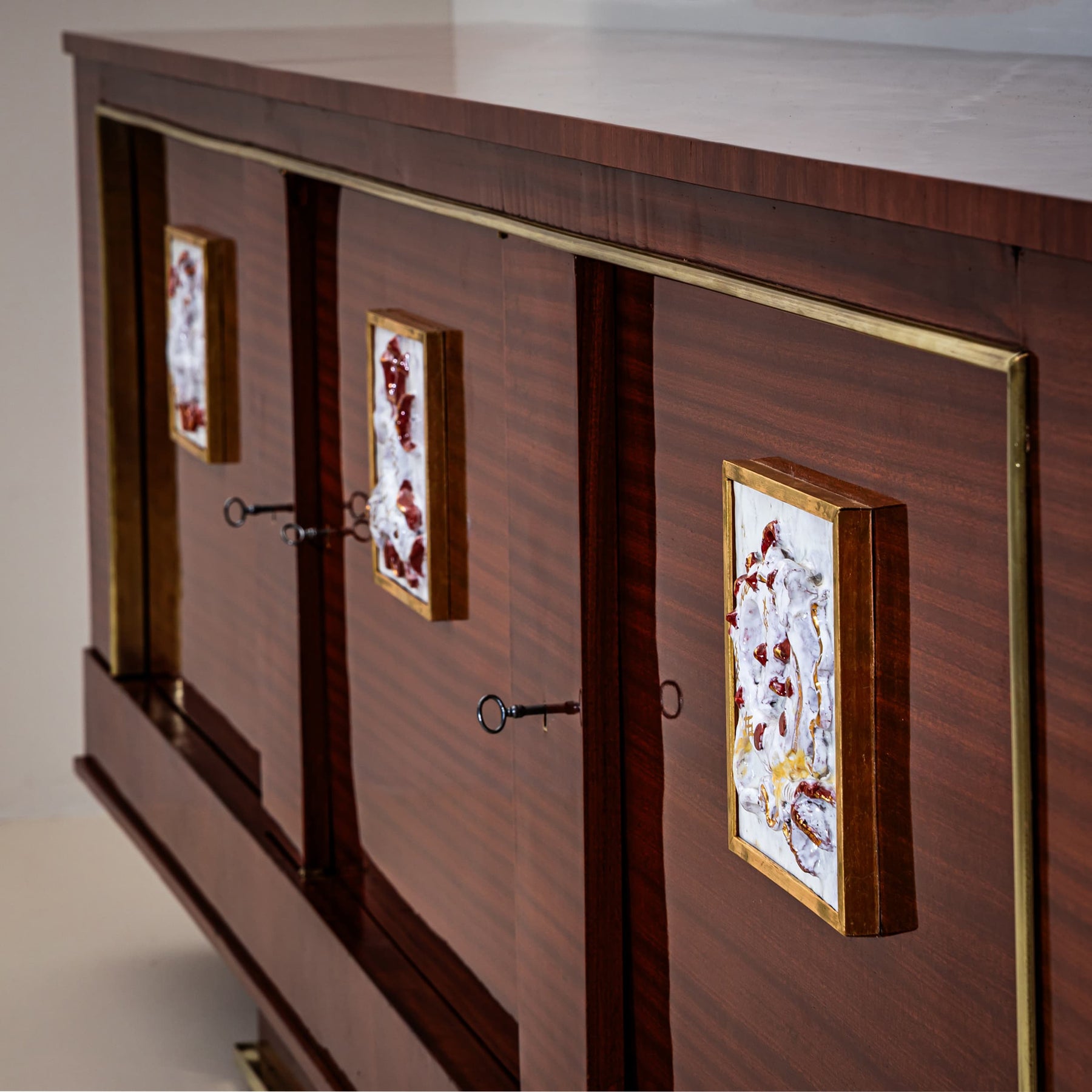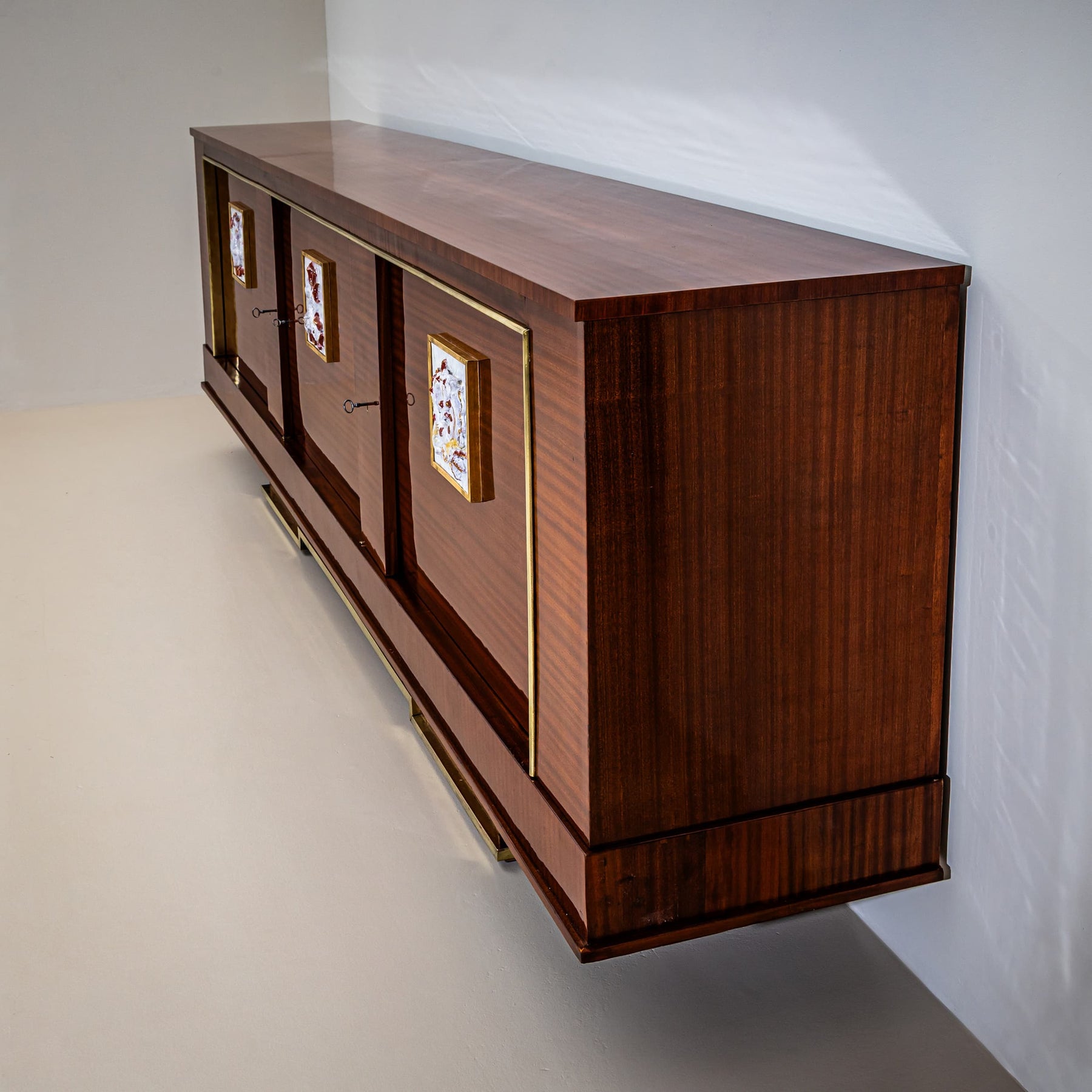 Large sideboard featuring five asymmetrically opening doors and a rectilinear case accented with a brass edge. The piece is veneered in mahogany and fitted with a single shelf behind each door. The doors are centrally punctuated by three ceramic panels. The ceramic elements were created by the French artist Françoise Bizette (1914–1996) and depict mythological sea creatures rendered in relief. The panels are signed “F. Bizette” at the lower right. Bizette produced her ceramic works in her own kiln in Sèvres and worked on commission, including projects for the French state. The sideboard represents a rare and compelling synthesis of French postwar furniture design and artistic ceramic production. Françoise Bizette was a French ceramic artist, painter, and printmaker. She studied at the École des Beaux-Arts in Paris and at the École du Louvre and began her career as a drawing instructor in 1939. She later taught ceramics and art history, notably in Montpellier and at the Lycée de Sèvres. From the early 1950s onward, Bizette regularly exhibited at major French salons, including the Salon d’Automne, the Salon des Artistes Décorateurs, and the Salon des Femmes-Peintres. She received several awards and, between 1956 and 1989, executed monumental ceramic commissions for the French state, public institutions, and historic monuments.