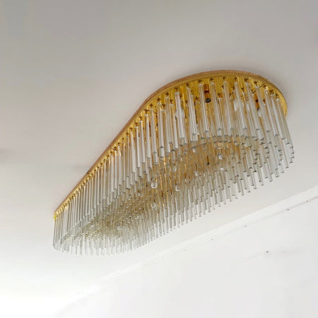 A room scale Venini Glass chandelier comprised of multiple triangular drop solid glass rods ("Triedro"). The ceiling plate features several gold reflective metal plate components. There are two quarter pieces at each end and several square components in between, making it possible to create different sized combinations.  Each metal plate component has multiple surface mounted lamps hanging among the glass rods.