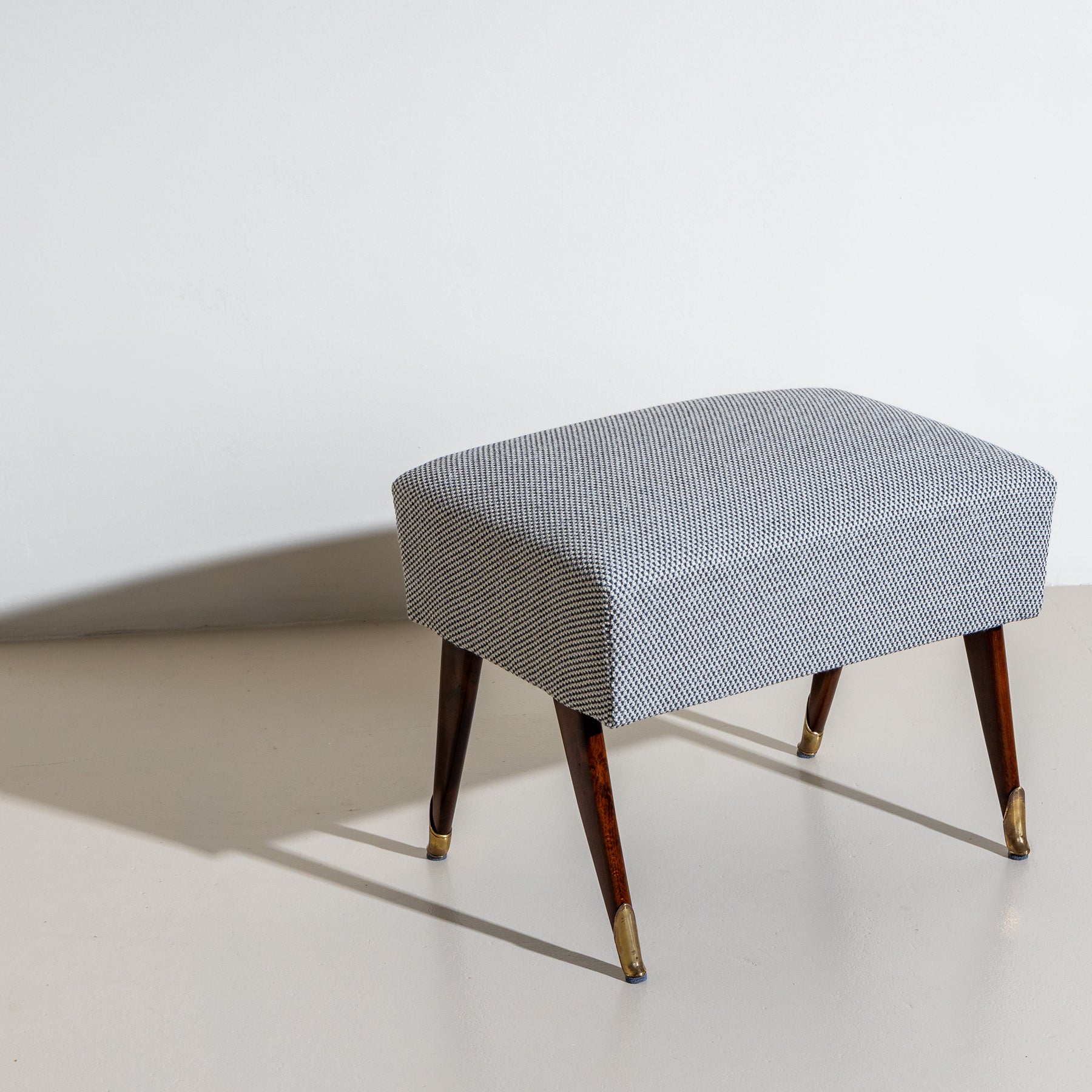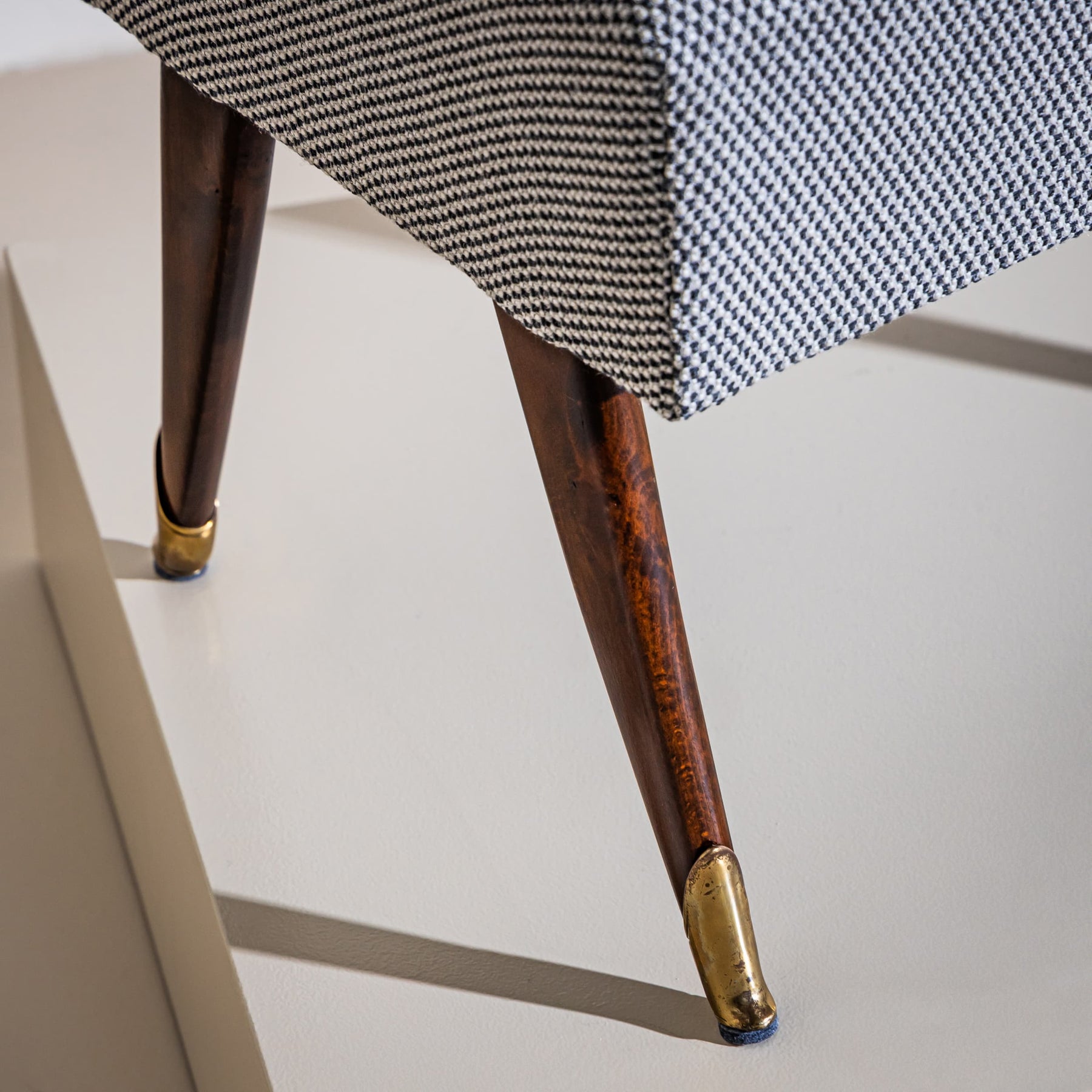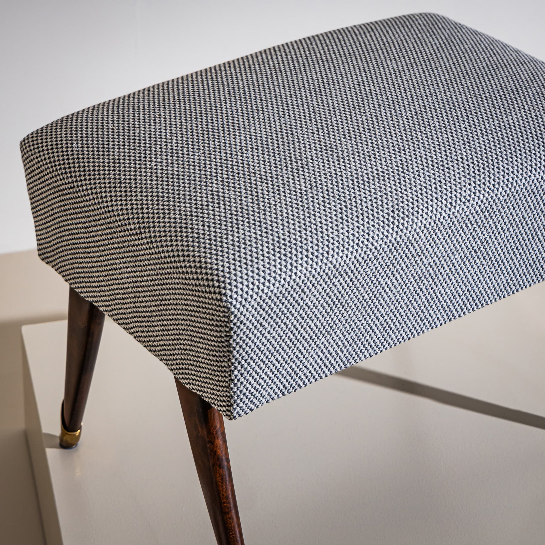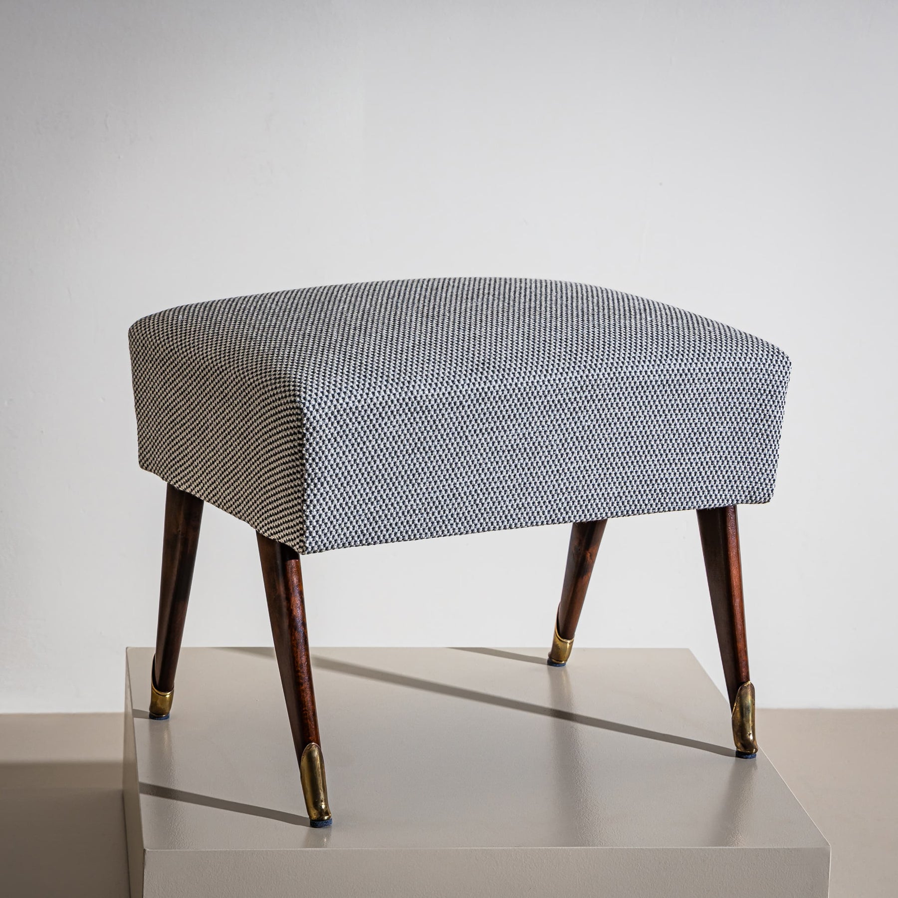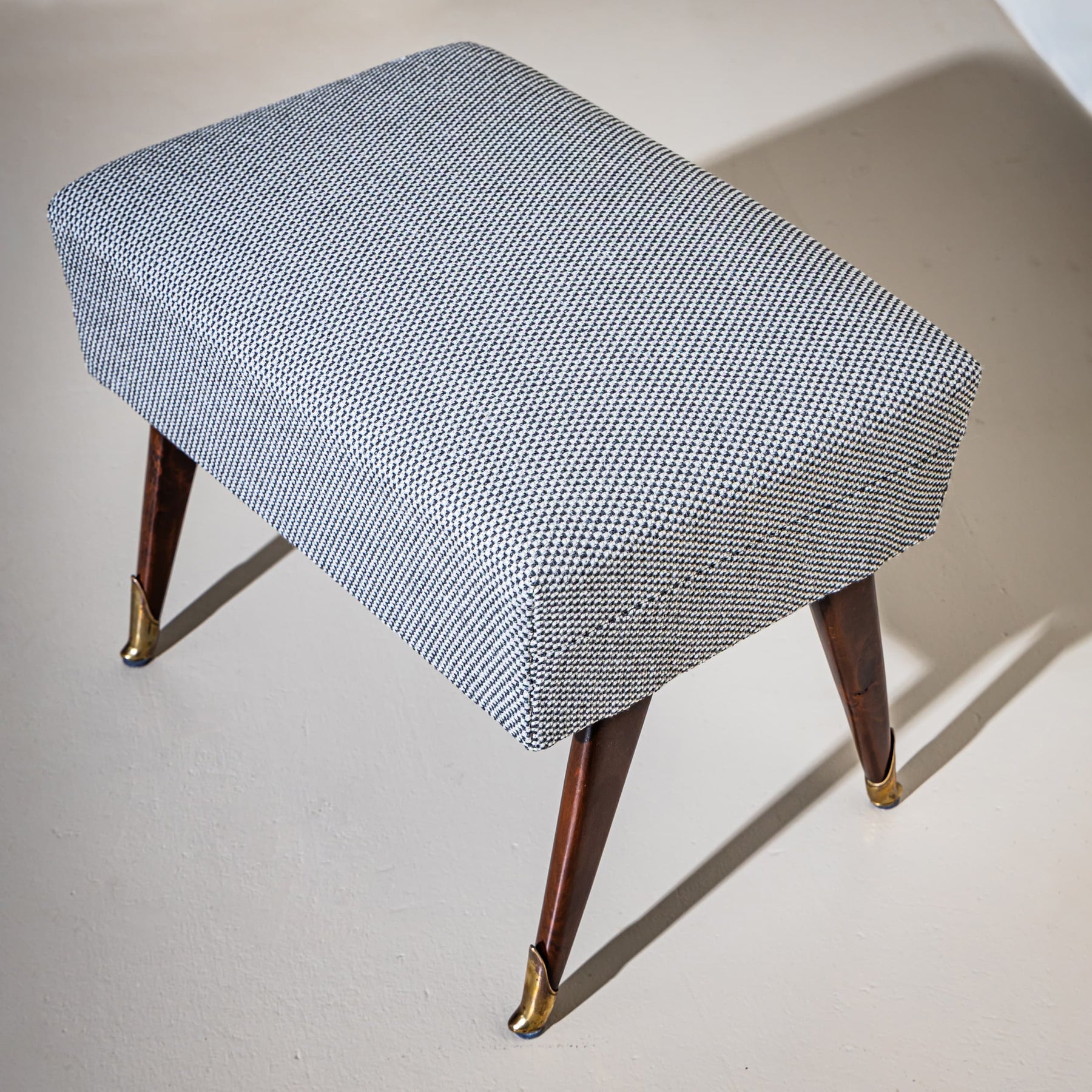 Small mid-century stool raised on splayed tapered wooden legs with brass sabots. Newly upholstered in black and white fabric and professionally polished.
