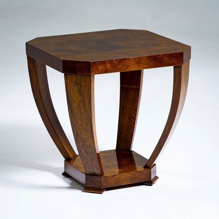An elegant Art Deco side table crafted from walnut, featuring an octagonal tabletop and a base connected by gracefully curved struts.