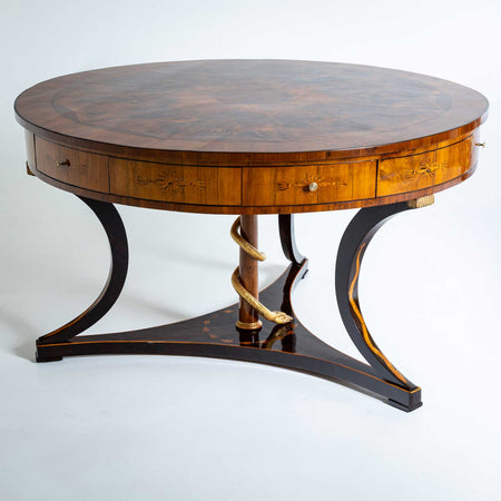 A large library table with six drawers and a trefoil stand with three sabre legs and a central column. A carved, gold-patinated swan's neck wraps around the column. The round table top is made of radially veneered burl wood with a sun symbol at the centre and a wreath of leaf ornaments. The drawer fronts are also inlaid with leaf motifs. The table has been restored and polished by hand.