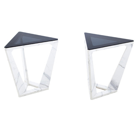 Pair of Italian Modern triangular side tables. Marble and glass.