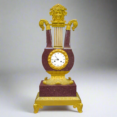 An important Charles X imperial porphyry lyre clock. Crafted from red porphyry and ormolu. Movement signed and dated 1828.