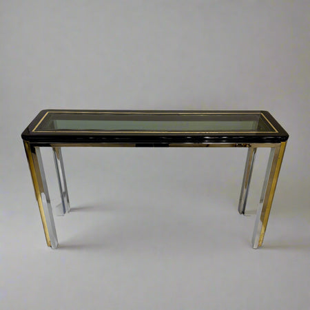 Architectural console table with faceted legs in chrome and brass, supporting a black lacquer framed top with glass inset and gold edge detail. Italy, 1970's