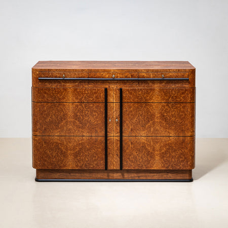The double doors reveal an interior with three large drawers fitted with round handles, veneered in light maple, creating a striking contrast to the exterior. A remarkable example of the refined design and craftsmanship of the Art Deco period.
