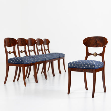 Set of six Biedermeier dining chairs featuring elegantly curved legs, straight frames, and oval backrests with a central strut adorned with a brass rosette applique. The chairs are veneered in mahogany and have been polished. Additionally, they have been expertly reupholstered with a fleur-de-lis pattern on a rich dark blue base